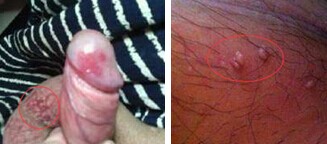 (左)阴囊溃疡,(右)阴囊靠大腿根部长肉粒