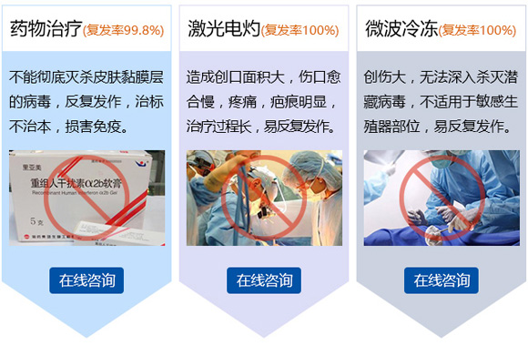 三、微波冷冻:只能清除疣体,进行表面治疗,患者体内的潜伏病毒仍旧存在,会导致尖锐湿疣的反复发作。