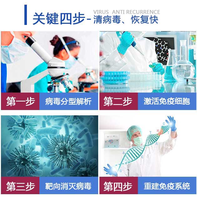 运用多项医学诊疗设备和抗病毒药物,破坏病毒的生物链,有效针对潜藏于神经节内的病毒,让病毒无法复制、修复和生存。有效针对各种亚型病毒损害性(严重情况)而施治,实现了真正的个体化治疗,达到完全消除疣体不反复的目的。